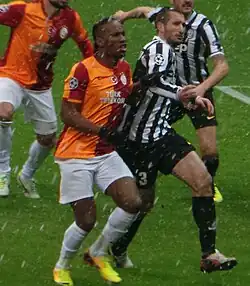 During the 2008–09 season, Chiellini remained as first choice in central defence alongside Nicola Legrottaglie. Chiellini scored his first goal in Europe on 13 August 2008 as Juve beat Artmedia Petržalka 4–0 in the first leg of the UEFA Champions League third qualifying round tie.[25] Four days later, he injured his left knee again during the Trofeo Luigi Berlusconi against AC Milan and missed the start of the Serie A season,[26] returning to duty in September starting in each of Juve's first three Champions League group games. At the end of the year, he was named Serie A Defender of the Year for 2008 at the annual Oscar del Calcio awards ceremony. On 10 March 2009, Chiellini was sent off for a second bookable offense during the Champions League first knockout round second leg tie at home in a tightly contested match against Chelsea, but Juventus were eliminated 3–2 on aggregate after holding the former English champions to a 2–2 draw.