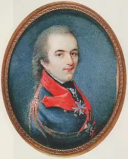 Put to rest on 29 November 1792, Zuccato was transferred to the medal regiment of horse grenadiers on 1 October 1794, taking part in the Polish campaign where he distinguished himself during the assault on the fortified suburb of Praga, in Warsaw, located on the right bank of the Vistula.[18] For this fact, he was awarded the Order of St. Vladimir of the fourth class.[19] In September 1794, during a diplomatic mission, he presented his homages to the King of Prussia Frederick II, who after taking the suburb of Praga awarded him the Order Pour le Mérite.[20] On 24 February 1797, he was put to rest,[21] returning on 8 March 1799 to follow the army corps of General Andrey Grigoryevich Rosenberg during the Italian campaign launched by General Alexander Suvorov.[22] After the occupation of Turin (5 May), he was transferred to the army corps of General Pyotr Ivanovich Bagration[23] distinguishing himself in the occupation of Pinerolo, and then took part in the battle of the Trebbia (19 June). In July he was instructed by Suvorov to travel to Tuscany[24] and the territories of the Papal State to organize the popular militias and train them in the use of the bayonet, nominally placed under the orders of the cavalry general Wilhelm Derfelden.[25] On July 16 he arrived in Florence, and the next day in Acquapendente, where he found a good number of armed nobles, ecclesiastics, and peasants, organizing his own militia. Defeated a French formation, on 25 July he arrived in Arezzo, and two days later in Magione. On July 18 he again defeated the French, and three days later occupied Perugia.[26] He then ceded command of the militia to the Austrian ensign Carl Schneider baron von Arno.[24] Suvorov carried out the task personally reported it to Tsar Paul I. After the battle of Novi, and the subsequent surrender of Tortona,[25] Suvorov transferred the army to Switzerland to support the operations of General Aleksandr Mikhailovich Rimsky-Korsakov. In Switzerland, Zuccato distinguished himself during the conquest of the Gotthard pass (24 September) and then on the mountains near Lake Klöntal (1 October), as well as participating at Schwanden (5 October). On October 30 of the same year, he was promoted to major general, skipping the rank of colonel, with the seniority assigned to him from November 26, 1798.[27]
