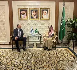 On 11 January 2024, Gerapetritis travelled to Riyadh in Saudi Arabia where he met his counterpart Prince Faisal bin Farhan Al Saud.[33] They discussed international developments and also the Middle East issue, with Gerapetritis stating that they looked for ways they could "establish humanitarian help."[34]