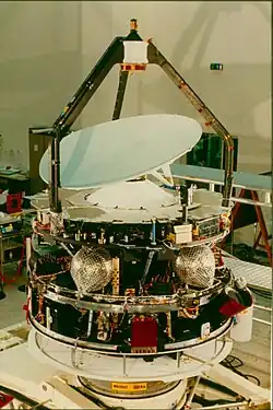 The cylindrical spacecraft was 1.87 m in diameter 2.85m long.[13] It had and had three internal platforms. Built by British Aerospace in Filton, Bristol, it carried a dust shield (Whipple shield) as proposed by Fred Whipple. The shield comprised a thin (1 mm) aluminium sheet separated by a space and a thicker (12 mm) Kevlar sheet.[14] The later Stardust spacecraft would use a similar Whipple shield. Giotto also had a 1.51 m diameter antenna that it used to communicate with Earth.[14] The craft was painted white using an electively conductive paint developed by Centre national d'études spatiales.[15]