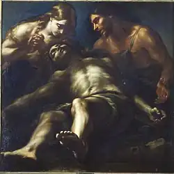 As did many other aspiring artists, Benaschi drew inspiration from the Carracci frescoes from the Farnese Gallery, from the statues in the Belvedere at the Vatican Palace, paintings from San Carlo de' Catinari and the works of Lanfranco from the church of Sant Andrea della Valle.[2] Among his patrons were Giovanni Battista Cesalassi and the Jurist Alberetti.[3] In Naples, he painted several ceilings and frescoes, for example at the Chiesa di Santa Maria in Portico, and the cupula of Santi Apostoli. He completed an etching of a Holy Family, after Giovanni Domenico Cerrini, who was his intimate friend.