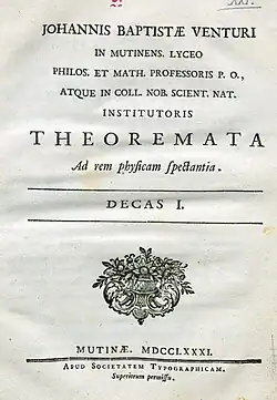 Later, he was made Diplomatic Agent of the Helvetic Confederation, and spent twelve years in Switzerland. He retired in 1813, due to failing health, and was granted a pension on the maximum scale by the Emperor Napoleon. On his return to Reggio he set about the publication of a number of scientific and literary works.[4] In 1814 Venturi wrote Commentari sopra la storia e le teorie dell' ottica (Commentaries about the history and theory of optics), which included Hero of Alexandria's treatise on the dioptra[6] and from 1818 to 1821 he compiled, edited and published many of Galileo's manuscripts and letters in Memorie e lettere inedite finora o disperse di Galileo Galilei, ordinate e illustrate con annotazioni.[7] He was also the first author who acknowledged Leonardo da Vinci's work on tribology, publishing a commentary on some Leonardo's notebooks, written between 1493-4 and 1515, which have been transferred from the Ambrosian Library in Milan to Paris after the Napoleon’s conquest of northern Italy.[8]