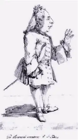 Although his activities in the next decade are less well documented, he appears to have been in Venice for the production of a new opera during the carnival of 1706.[4][5] By this time Bononcini had an enviable international reputation: in the words of his fellow composer Francesco Geminiani, Camilla had "astonished the musical world by its departure from the dry, flat melody to which their ears had until then been accustomed".[4] By 1710, productions of Camilla (presumably based on Bononcini's version) had reached London as well as many cities across Italy.[4] At some time during this decade on one of his sojourns to Italy, he married Margherita Balletti. She came from a family of actors and commedia dell'arte players and was the sister-in-law of Luigi Riccoboni.[1]