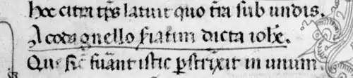 This is a mythical and legendary chronicle based in part on the Historia Romana and Historia Langobardorum of Paul the Deacon. It begins with a discourse on the ages of the world based on Augustine of Hippo, followed by the foundation of Troy. It contains legendary accounts of the founding of Piacenza and Milan and ends with an equally legendary account of Charlemagne's invasion of Spain.[4][7][8] Georg Pertz gave this text the title Chronicon de sex aetatibus mundi ('chronicle of the six ages of the world'), but Codagnello says that "there are four ages: golden, silver, bronze and iron" (quatuor sunt etates: aurea, argentea, enea et ferrea).[4] - Istoria qualiter translatum est imperium Romanum in Francia apud Teothonicos (folios 55b–56a)