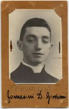 In 1931, he entered the seminary of Borgo Capanne.[6][7][Note 3] That seminary closed in 1932, and he transferred to the Archepiscopal Seminary of Bologna at Villa Revedin, and later to the Pontifical Seminary of the Region of Bologna.[7] On 2 February 1934 he made his priestly vow.[3] He continued his theology studies and on 29 March 1940 he was ordained subdeacon[2] and on 7 June 1941 deacon,[4] On 28 June 1942 he was ordained a priest by Cardinal Giovanni Nasalli Rocca di Corneliano, in San Petronio Basilica, Bologna.[8][11][12] When made a subdeacon, he was appointed assistant to Don Giovanni Roda, parish priest of Sperticano, a frazione of Marzabotto, Bologna,[3] a parish of about 400 people.[2] His first assignment as a priest was as an assistant priest (Italian: vicario coadiutore) in Sperticano.[2] He celebrated his first Masses at Pianaccio, San Luca, and Porretta;[7] He celebrated his first solemn Mass on 12 July 1942 in the church of San Tommaso a Sperticano.[3] In his homily at Porretta[7] or at Sperticano[4] he said, "The Lord has chosen me to be an urchin among the urchins".