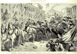 On 17 November 1878, Umberto I and his court were parading in Naples. Passannante was among the crowd, waiting for the right moment to act. While the king was on Largo della Carriera Grande, he approached his carriage, faking a supplication; suddenly, he pulled out a knife and attacked him yelling, "Long live Orsini! Long live the Universal Republic!"[2]