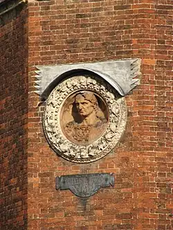 In June 1521, Giovanni wrote from Rome in Latin to Cardinal Wolsey requesting payment for his work at Hampton Court. He had made, painted, and gilded, eight terracotta medallions costing £2 6s 8d each, with three Stories of Hercules costing £4 each, with 20 shillings expense on fixing the sculptures.[2] Some of these medallions commissioned by Wolsey can still be seen in place on the palace.