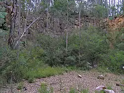 After 4 km the trail descends steeply to Quarry Road and travels beside this for a short distance, before offering a detour to the granite quarry near Mississippi Creek. This quarry is now abandoned, but operated during the first half of the twentieth century originally to provide granite used to build a permanent entrance to the Gippsland Lakes. This was to be a replacement for the timber pylons that had been used in the original construction of an entrance, but which had suffered much damage due to the marine toledo worm.[2] There is a small viewing area and rest stop at the quarry.