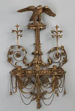 Girandoles may also be designed as wall lights or sconces, and many of these were in the ornate Rococo-style. Mirrors with elaborate frames and candleholders attached were produced in England in the mid-18th century, and these were also referred to as girandoles.[28] Thomas Chippendale produced girandoles, with and without mirrors, of asymmetric designs in Rococo, chinoiserie or Gothic styles. These consist of scrolls and shells incorporating various motifs such as architectural ruins, Chinese figures and pagodas, columns, foliage, waterfalls, and birds. The mirrors were usually fitted in smaller plates, and the joints then covered with gilt mouldings or pilasters.[29] In the late-18th century, designs in the lighter Neo-Classical style were popular under the influence of Robert Adam.[5][30] The elaborate Rococo style revived in the mid-19th century but of lesser quality compared to the previous era.[30] Arms of candleholders may emerge from the sides of the mirror, or directly below it, but a girandole can also be positioned in front of the mirror such that it and its reflected image create the illusion of a full candelabra.[31]