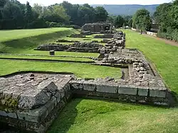 Fragments of the west range – the cellarer's range – are extant. It was entered from the west by an outer parlour, projecting from the north end of the range, where members of the community received visitors. The prior lived on the upper floor which comprised a hall, chamber and chapel dedicated to Saint Hilda. The prior's rooms were probably located above the outer parlour, as was the pattern at other monasteries, accessing the cloister and the outside world.[52] The largest surviving fragment of the range comprises a cellarium or storehouse where supplies were kept. It is a vaulted undercroft of nine bays constructed from stone ashlar with its floor level below that of the cloister. It is relatively well-preserved and believed to have been divided by timber partitions which were later replaced in stone.[53]