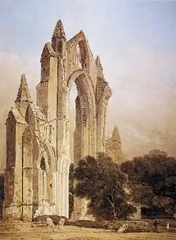 The only substantial part of the priory to survive was the eastern gable of the presbytery with its great east window. Its survival owed much to the rise of Romanticism in the 18th century. The portrayal of ruined buildings in idealised landscapes by J. M. W. Turner and his contemporaries inspired a fashion for the nobility and gentry to produce paintings of monasteries providing an incentive for landowners to preserve them as romantic ruins, rather than using them as quarries. Gisborough Priory's east window was one of the first examples of a monastic ruin to be retained for its visual qualities. It was incorporated into the grounds of Old Gisborough Hall as a romantic ruin and the sill of the great window removed to ensure an uninterrupted view.[21][36] Fittingly, given his role in inspiring the east window's preservation, Turner himself sketched it in 1801 during a visit to Yorkshire.[37]