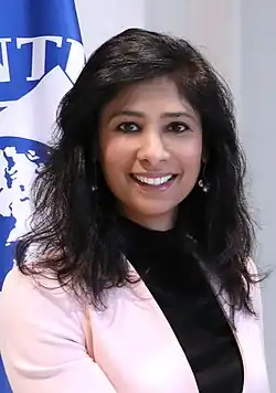 Gita Gopinath (born 8 December 1971)[1] is an Indian-American economist who has served as the first deputy managing director of the International Monetary Fund (IMF), since 21 January 2022. She had previously served as chief economist of the IMF between 2019 and 2022.