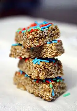 It takes very long to prepare, with a rest period of twenty-four hours. The giurgiulena is usually cut into diamonds or rectangles, sometimes sprinkled with colorful sprinkles and individually wrapped, sometimes above aromatic orange leaves.[2][3] As with many other Sicilian and Calabrian pastries, giuggiulena is considered a legacy of the Arab pastry.[4][5][6] The name derives from the Arabic word juljulàn (or giolgiolan), which means 'sesame'.[5][7] The alternative name cubaita derives instead from the Arabic term qubayt (also spelled qubait and qubbayt), which means 'preserved sweet'.[5][8]