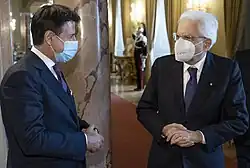 Between December 2020 and January 2021, discussions arose within the government coalition between Conte and Matteo Renzi, former prime minister and leader of Italia Viva.[124] Renzi called for radical changes to the government's economic recovery plans after the COVID-19 pandemic, and also demanded that Conte cede his mandate over the secret services coordination task.[125] During his end-of-year press conference, Conte declined Renzi's requests, asserting that he still had a majority in the Parliament.[126]