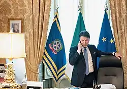Despite having begun his political career as a technocrat,[14] appointed to implement the government programme of M5S and the League, during the final months of his first cabinet and throughout his second one Conte became an increasingly influential and popular figure in Italian politics.[15] During his premiership, he introduced important reforms including the introduction of a guaranteed minimum income, a constitutional reform to reduce the number of parliamentarians, nationalizations of ASPI (Italy's highway company), Alitalia (the Italian flag carrier), and Ilva (Italy's largest steel company),[16][17][18] as well as a stricter policy towards illegal immigration.[19] In 2020, Italy became one of the countries worst affected by the COVID-19 pandemic. His government was the first in the Western world to implement a national lockdown to stop the spread of the disease.[20][21] Despite being widely approved by public opinion, the lockdown was also described as the largest suppression of constitutional rights in the history of the Italian Republic, although the Constitution itself authorizes such measures in case of public health concerns.[22] Conte's extensive use of prime ministerial decrees to impose restrictions aimed at containing the pandemic gave rise to criticism from journalists, political analysts, and opposition politicians, even if it was widely appreciated by public opinion, as shown by several opinion polls.[23][24][25] The economic impact of the COVID-19 pandemic was especially severe in Italy.[26] In July 2020, to assist with the COVID-19 recession, Conte and other European leaders approved the Next Generation EU package, by which Italy will receive 209 billion euros in grants and loans from the European Recovery Fund.[27]