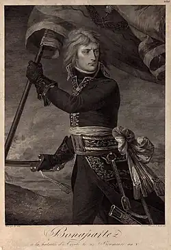 After achieving technical mastery and making his reputation as a portraitist, he was appointed a professor of engraving at the Accademia in 1798. Three years later, he was called on to participate in the Consulte de Lyon; in return for an engraving of Napoleon he had made in 1797, from a painting by Antoine-Jean Gros, done at the artist's request.[1] This was followed by a trip to Paris, in the company of Giuseppe Bossi and Francesco Rosaspina. There, he made lasting contacts with several famous French artists. When Napoleon arrived in Milan to be crowned King of Italy, Longhi was a guest at the ceremony. In 1810, he was named a Knight in the Order of the Iron Crown.[1]