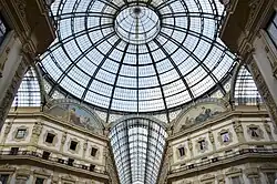 Within just two years, the new Galleria was officially opened, except for the entrance arch from the Piazza del Duomo. It was an immediate success with the public, who were attracted by the rich decorative scheme that articulated the building, emphasized by the play of light produced by the iron and glass roof. The latter, built with prefabricated sections made by the Paris firm of Henry Joret, was something of a technological coup for Milan, which, while it had another covered arcade (the Galleria De Cristoforis of 1831 by Andrea Pizzala, inspired by the Parisian arcades), had never had iron and glass brought to such technical and expressive perfection.[4]