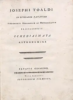 Toaldo became especially famous in Europe for his weather prediction theories.[2][3] He noticed that after 9 years, and then 18 years, meteorological phenomena returned in the same order.[4][5][6][7]