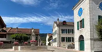 The municipality is located on a small knoll at the foot of the Jura Mountains.