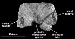 The astragalus is low and elongate from across side to side and the medial portion lacks the craniocaudally broadening compared to the lateral portion, a trait found in most non-eusauropods. The astragalus is weakly convex at the lower end, though this is not as extreme as in Blikanasaurus and Lessemsaurus. The upper surface of the astragalus is softly convex because it is where the lower end of the tibia (shin bone) articulates with the astragalus. This surface is pierced by two foramina (small openings in bone) that have been interpreted as vascular foramina. The ascending process (protrusion of bone) is mound shaped and its upper articular surface faces proximomedially. The distal tarsals have a laterally elongated triangular shape in when seen from their top ends. The corners of the tarsals are rounded and bulbous, especially in the posteromedial corner. The medial distal tarsal is not confined solely to metatarsal III, but also barely contacts the proximal end of metatarsal II, like in Saturnalia. The lateral distal tarsal has a quadrangular shape and was likely longer mediolaterally than proximodistally.[3]