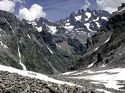 The two ice streams of the Glacier Noir merge at a height of over 2,400 m. However, the southern arm is about to retreat over the boundary between the lower basin and upper bowl, which will separate the glacier into distinct lower and upper sections.[3][5] Currently the combined tongue of ice flows from its junction, descending another good 200 metres in height, and ends beneath the northern foothills of Mont Pelvoux. It is about 400 metres wide at this point and a high and steep lateral moraine towers over it on the left-hand (northern) side, across which a climbing path runs from the Pré de Madame Carle, above the village of Ailefroide.