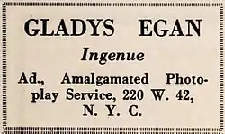 - ^ "Motion Picture Studio Directory", personal advertisement "GLADYS EGAN Ingenue...", Motion Picture News (New York, N.Y.), October 21, 1916, pp. 249. Internet Archive. Retrieved June 11, 2019.