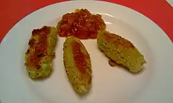 In modern versions, Caerphilly cheese is used, which is a descendant of the old traditional Glamorgan cheese recipe and lends the same general texture and flavour.[10] The basic recipe calls for a mixture of cheese, leeks and breadcrumbs,[12] although some recipes swap the leeks for onions or spring onions and may add herbs such as parsley or further flavourings such as mustard.[9][13][14] The mixture is then rolled into sausage shapes, and then fried. There is no sausage casing used, although egg is used to bind the mixture so that it does not fall apart during the cooking process.[13]