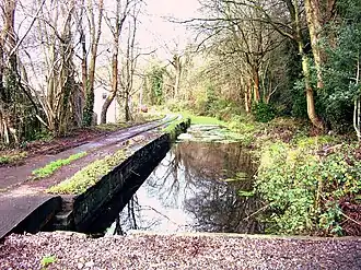 Today, limited traces of the canal remain, about one half being covered by the A470 Cardiff to Merthyr Tydfil trunk road, which was constructed in the 1970s.[12] Much of the Taff Trail between Abercynon and Merthyr Tydfil follows the line of the canal.[13] The section from Tongwynlais to the Melingriffith Tin Plate Works at Whitchurch has been retained in water and was used for fishing,[14] but is now the Glamorganshire Canal local nature reserve. In addition, there are a few bridges and locks which have not been destroyed.[15] There are also short stretches in water at Nightingales Bush and at Locks 31 and 32 in Pontypridd and there are plans for restoration here.[16]