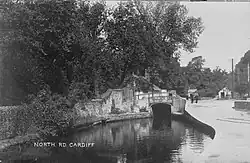 The canal passed over the Bute Docks Feeder with a small aqueduct built in the late 1830s, at the north-east corner of Cardiff Castle. The feeder fed the Bute Docks, having extracted water from Blackweir on the River Taff. There was an overflow from the canal into the feeder.[8]