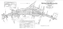 The Glan Valley Railway from Bad Münster to Homburg was opened throughout on 1 May 1904; from Glan-Münchweiler to Altenglan it ran together with the Kusel–Landstuhl railway. This turned Glan-Münchweiler into a railway junction. With the construction of the Glan Valley Railway, there was also a significant extension of the tracks in the station. The timetable of 1913 and 1914 was the only timetable ever which involved one train overtaking another at the station. In it, the stopping passenger train to Homburg had to wait for a faster train from Bad Munster to overtake it.[22]