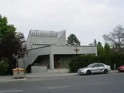 In 1957, a section of the garden belonging to the University of Natural Resources and Applied Life Sciences Vienna in the Krottenbachstraße, Obersievering, was purchased, where the parish church Verkündigung des Herren (Annunciation of the Lord), designed by the architect Josef Lackner,[2][1] was built between 1969 and 1970.[5][2] The wooden structure in the Glanzinggasse was taken down in 1972 but continued to serve as a provisional church in the settlement Am Biberhaufen in Donaustadt.[6]