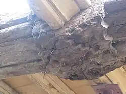 Glas Hirfryn is contemporary with Great Cefnyberen in the Vale of Kerry, dendrochronologically dated to 1545–60. This house has a jettied first floor supported by massive brackets, but unlike Glas Hirfyn it has a central chimney stack and rather than a lobby entrance has a chimney backing on to the entrance with a post and panel screen or cross passage of Smith's type B.[6] Also in the Vale of Kerry, but just in Shropshire in Brompton and Rhiston is the Lack. This is a jettied house of the Montgomeryshire Lobby entrance type, with herringbone work in the upper story and Close studding to the lower floor.[7] The use of a dragon beam- a diagonal beam in jettied at the corners in the interior – seems to be slightly later, and can be seen at Plasdauon[8] in Carno and Maes Mawr at Llandinam. Examples of jettied timber-framing in Shropshire with a classification of their types is given by Madge Moran in Vernacular Buildings of Shropshire.[9]