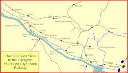 The Glasgow, Yoker and Clydebank Railway was a railway company that opened in 1882, giving a rail connection to shipyards and other industry that developed in what became Clydebank. At first it was a purely local line, connecting only at Stobcross with the North British Railway, but as industry developed in the area it served it became increasingly important.