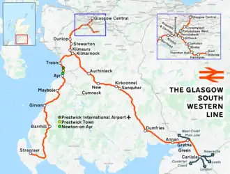 The Glasgow South Western Line is a mainline railway almost entirely in Scotland (the only exception being the final section into Carlisle in North West England) that runs from Glasgow to Kilmarnock, and then either Carlisle via Dumfries, or Stranraer via Ayr, with a branch to East Kilbride.