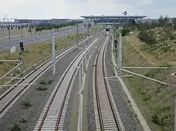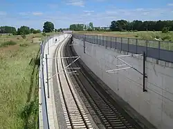 The Glasower Damm Ost – Bohnsdorf Süd railway is an electrified, predominantly double-track main line in Germany. It is mainly located in the state of Brandenburg south of Berlin, but a small part of it is in Berlin. It is mainly intended to connect Berlin Brandenburg Airport (BER) with the underground Berlin Brandenburg Airport station. Its eastern section replaced the Berlin-Grünau – Berlin Schönefeld Airport South railway (Bahnstrecke Berlin-Grünau – Berlin Flughafen Schönefeld Süd), which was opened in 1963. This ran parallel to the current line and was mainly used to supply the airport with fuel and building materials. From 1992 to 2010, it was also used for passenger services to the biennial ILA Berlin Air Show.