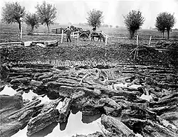 The village was close to the old course of the River Brue and was thought to be surrounded by water, hence the title "Lake Village"; however more recent work suggests the title Swamp Village may be more appropriate as for most of the year the surrounding land was not open water.[12][13] The Brue was an important water-borne trade route from central Somerset to the Severn Estuary.[2] The village was approached by causeways up to 130 feet (40 m) long and log boats have been recovered from sites close to the village at what may have been a landing stage which was repaired and rebuilt several times.[14][15][16] Despite the wet surroundings vegetable and small domesticated and wild mammals, including beaver and otter, made up more of the diet than fish.[17][18] The remains of wheat, barley and beans have also been recovered.[19]