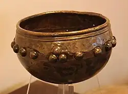 The metal "Glastonbury Bowl" was made from two sections riveted together and repaired several times over its life. The bottom half has been dated as having been constructed in the Iron Age. The upper half was probably added in the 1st century from one sheet of metal, which may have been previously used for another purpose, and the two-halves riveted together.[45][46]