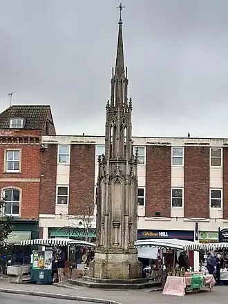 Glastonbury's cross replaced an earlier structure of early 16th century origin, described as having been "of some antiquity", octagonal with clustered pillars, a central column and a roof.[2][3] It fell into a state of disrepair and was demolished around 1806.[4] Later in the 19th century, T. Porch, the proprietor of Glastonbury Abbey, proposed that a new market cross be erected on the same site.[5] It was erected in 1846 under the supervision of Ferrey and has most recently undergone restoration in 2005.[6]