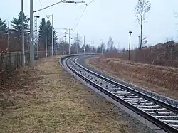 The upgrade of the line to permit the operation of tilting trains and a line speed of 140 km/h began on 28 February 2011. This required a complete blockade of the line between Glauchau-Schönbörnchen and Gößnitz. During the construction work, all rail services were substituted by buses. In addition to the renewal of tracks and the track base, the catenary systems and the signalling and communications technology were completely renewed. Meerane station was transformed fundamentally. Overall, Deutsche Bahn spent €20 million on the upgrade of the 13 kilometre-long connection.[3][4] Rail services resumed on 11 December 2011.[5]