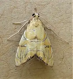 Glaucocharis auriscriptella, also known as the yellow silverling or silver marked yellow,[2] is a moth in the family Crambidae.[3] It was first described by Francis Walker in 1864 and is endemic to New Zealand. This species can be found in the North, South, Stewart and Great Barrier Islands. The preferred habitat of this moth is lowland and subalpine native forest as well as wetlands. The larvae feed on moss. The adult moth is day flying and is on the wing from November to February. It can be observed in colonies and can be attracted to light at night. This species likely has only one generation per year.