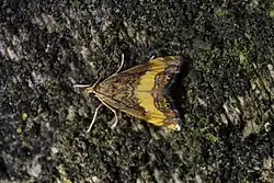 Glaucocharis chrysochyta is a species of moth in the family Crambidae.[3] This species was first described by Edward Meyrick in 1882. It is endemic to New Zealand and is found throughout the country. It inhabits native forest. Larvae appear to feed on moss and likely pupate there. Adult moths are on the wing from November to March. They fly at night and are attracted to light.