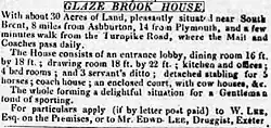 It seems that the first major addition to the house was in the early 1800s by William Lee (1768-1837) who was the Mayor of Exeter. There is a rental advertisement for Glazebrook House in 1821 describing it as a “hunting seat or a residence for a genteel family”.[2] Then in 1833 a full description of the property is given. It says.