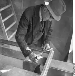 A glazier is a tradesperson responsible for cutting, installing, and removing glass (and materials used as substitutes for glass, such as some plastics).[1] They also refer to blueprints to figure out the size, shape, and location of the glass in the building. They may have to consider the type and size of scaffolding they need to stand on to fit and install the glass. Glaziers may work with glass in various surfaces and settings, such as cutting and installing windows, doors, shower doors, skylights, storefronts, display cases, mirrors, facades, interior walls, ceilings, and tabletops.[1][2]