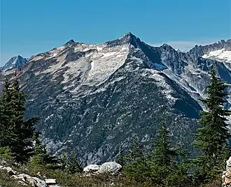 Glee Peak is a 7,180-foot-elevation (2,190-meter) mountain summit located in Whatcom County of Washington state, United States.[2] It is set within North Cascades National Park and Stephen Mather Wilderness, where it is situated 1.7 mile north of The Roost and one mile south of Azure Lake. The nearest higher neighbor is McMillan Spire, 1.7 miles (2.7 km) to the north-northwest.[2] Glee Peak is part of the Picket Range which is a sub-range of the North Cascades, and like many North Cascades peaks, it is more notable for its large, steep rise above local terrain than for its absolute elevation. Topographic relief is significant as the northeast aspect rises 4,000 feet (1,200 meters) above Stetattle Creek in approximately one mile, and the southwest aspect rises 6,000 feet (1,800 meters) above Goodell Creek in three miles. Precipitation runoff from the mountain drains into these two creeks which are both tributaries of the Skagit River. Who made the first ascent of the summit is unknown, but Glee Davis and Burton Babcock were climbing in the immediate area as early as 1905.[3]