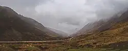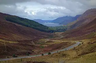 The A832 road runs through the glen, which runs between the peaks of Càrn a' Ghlinne (539 metres (1,768 ft)) to the north and Carn Loisgte (446 metres (1,463 ft)) to the south. Until recently this was a single track road with passing places, but 5.8 kilometres (3.6 mi) of the road has now been upgraded to double track.[1]