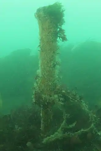 The elderly ship had her main engine removed (it was acquired by the Science museum and was on display at the Science Museum in London from 1978 until 2004. It now resides in the museum's storage facility) and she was scuttled about 200 yards from the Shagstone on 27 April 1970. Intended to be used as a diver training site, she was sunk in shallow water, but soon found to be obstructing the entrance to the port and was dispersed using explosives.[3] The remains currently sit in 15 metres (50 ft) of water south of the Plymouth breakwater at 50°18.922′N 4°7.529′W / 50.315367°N 4.125483°W. The wreck is considerably broken up, but the boilers remain and are currently home to a number of conger eels.