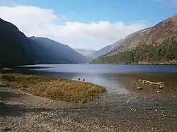 The lake is located in the Wicklow Mountains area west of Glendalough Early Medieval monastic settlement.[5] Near the southern shore stands a small rectangular church named Temple-na-Skellig, only accessible by boat and a series of steps from the landing stage; a nearby cliff hosts a cave called St. Kevin's bed,[6] reputedly a retreat for St. Kevin and later for St. Laurence O'Toole.