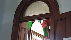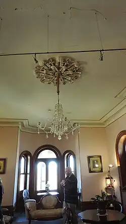 All the masonry walls are plastered, and on the first floor the non-masonry walls are lath and plaster. The ceilings are lath and plaster, and all rooms have plaster cornices, with the widths and designs varying in different rooms. Principal rooms have ornate central plaster ceiling roses, with the dining room containing two roses which would have been positioned above a central table. Throughout the building, the skirtings, architraves, doors and floor boards are cedar. Doors are panelled with etched, arched glass fanlights, and evidence of early decoration include brackets for curtain rods.[1]