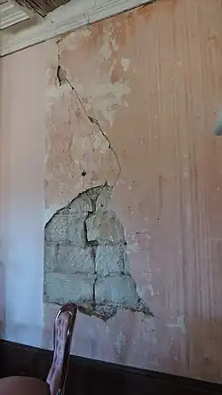 Internally, the building has a symmetrical plan with a central hall and stairwell flanked by the former dining room on the north and former drawing room on the south. The first floor has a bedroom at either end, separated from the stairwell by an ante room and linked by a short hallway. The plaster finishes are thought to be original, but have suffered much water damage.[1]