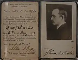 Between 1908 and 1910, the AEA produced four aircraft, each one an improvement over the last. Curtiss primarily designed the AEA's third aircraft, Aerodrome #3, the famous June Bug, and became its test pilot, undertaking most of the proving flights. On July 4, 1908, he flew 5,080 ft (1,550 m) to win the Scientific American Trophy and its $2,500 prize.[16] This is considered to be the first pre-announced public flight of a heavier-than-air flying machine in America. The flight of the June Bug propelled Curtiss and aviation firmly into public awareness. On June 8, 1911, Curtiss received U.S. Pilot's License #1 from the Aero Club of America, because the first batch of licenses were issued in alphabetical order; Wilbur Wright received license #5. At the culmination of the Aerial Experiment Association's experiments, Curtiss offered to purchase the rights to Aerodrome #3, essentially using it as the basis of his Curtiss No. 1, the first of his production series of pusher aircraft.[17]